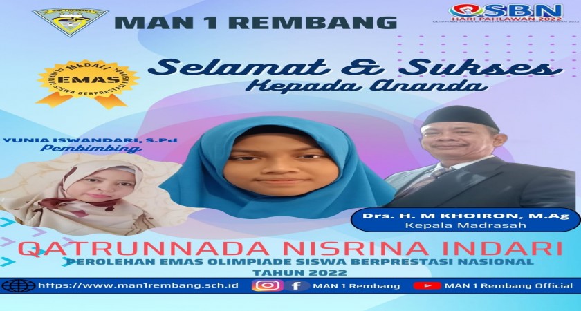 Satu peserta didik MAN 1 Rembang berhasil meraih medali emas tingkat nasional dalam ajang Olimpiade Siswa Berprestasi Nasional (OSBN) Tahun 2022 kategori mata pelajaran (mapel) Geografi SMA se-derajat yang digelar secara online pada Minggu (13/11/2022).