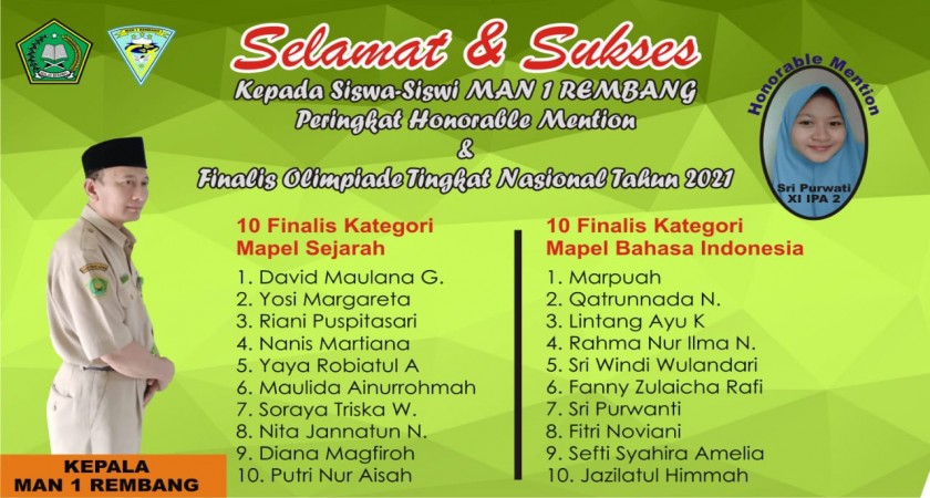 Sementara itu dalam kategori ini, Sri Purwati (XI MIPA 2) yang mewakili MAN 1 Rembang berhasil memperoleh nilai 160 menyandang peringkat Honorable Mention. Dalam kategori Olimpiade Bahasa Indonesia 10 siswa masuk finalis dan kategori Olimpiade Sejarah juga masuk 10 finalis. "Alhamdulillah selama proses bimbingan dari guru pembimbing membuahkan hasil yang luar biasa", ungkap Sri Purwati.