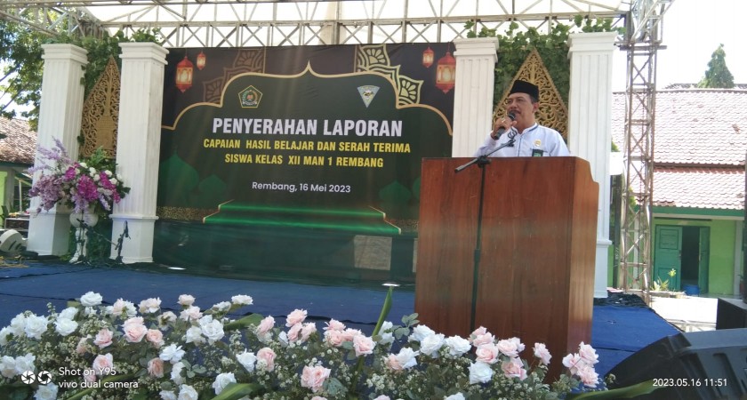 Hal tersebut disampaikan Kakankemenang Rembang saat memberikan sambutan dalam kegiatan "Penyerahan Laporan Capaian Hasil Belajar dan Serah Terima Siswa Kelas XII MAN 1 Rembang Tahun 2023" pada Selasa (16/7) di halaman setempat.