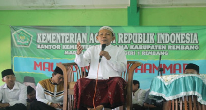 Rembang -- MAN 1 Rembang menggelar peringatan maulid Nabi Muhammad Saw bersama KH. Syarofuddin Al Qoymas. Kegiatan yang dimeriahkan oleh grup hadroh An Najah ini diikuti oleh seluruh civitas MAN 1 Rembang.